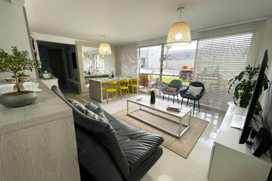 Segundo piso: tres habitaciones, cada una con baño privado; la habitación principal incluye vestier y baño completo. Dos de las habitaciones cuentan con aire acondicionado. Además, dispone de balcón y un cómodo estar de TV.